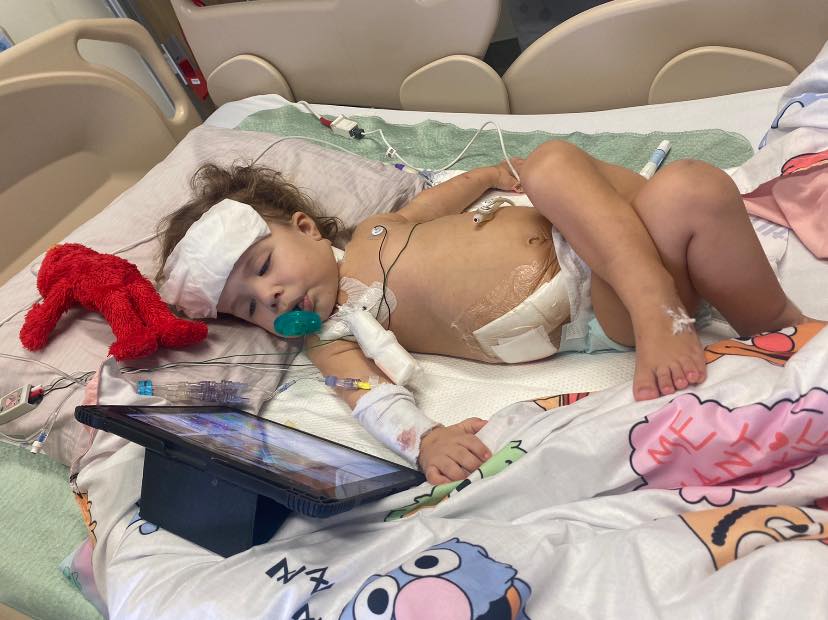 That’s Elmo from Sesame Street keeping Ferris company in her hospital bed in Vancouver. Ferris’s mother, Lindsey, says her daughter often crosses her legs in this fashion. (Photo: Lindsey Backmeyer/Facebook)