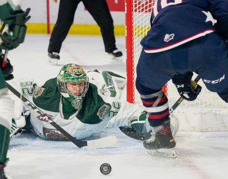 Goaltender Dustin Wolf of the Everett Silvertips has his eyes on the prize during a 3-0 victory over the Tri-City Americans on Wednesday night. Wolf has gone the distance in each of Everett’s three games and has yet to surrender even one goal. (Photo: Chris Mast/mastimages.com)